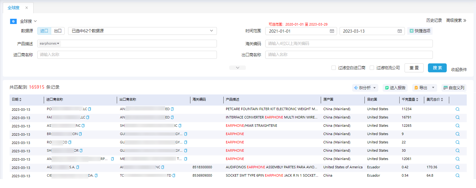 3. 结合该核心产品的特点从凯发K8天生赢家一触即发外贸通中,找出采购earphones的买家及其交易记录,顺利获得分析采购动态、交易趋势、供应链,竞品特点等等,有针对性的去挖优质潜客 。