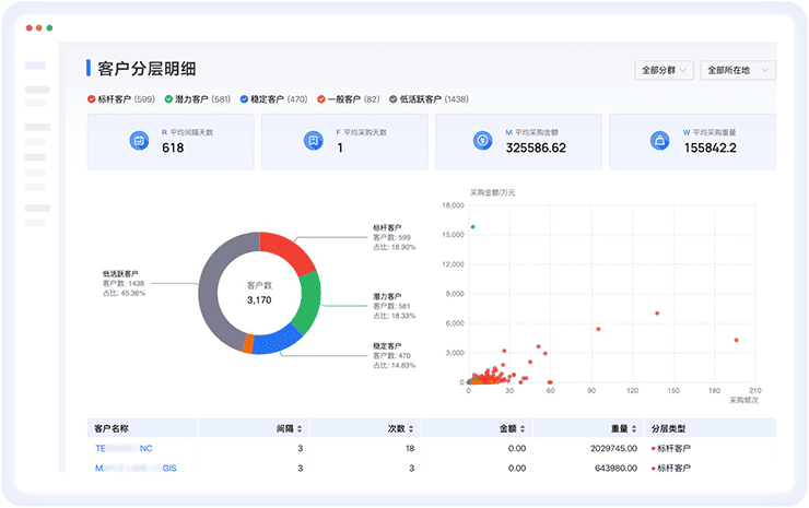 全面的客户画像,可视化呈现客户分布等;支持多种筛选条件及删除等操作,精细化管理;智能监测客户动态