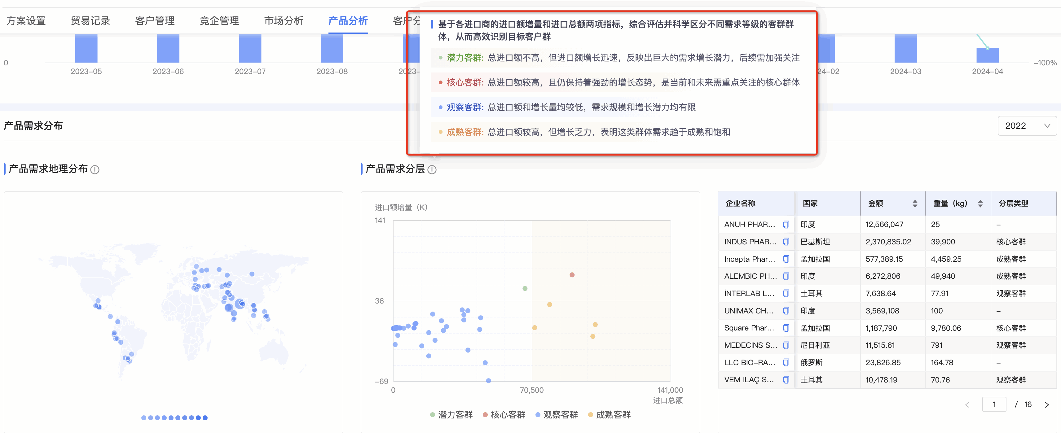 ● 产品需求分层图:凯发K8天生赢家一触即发数据通将需求客群按照进口额增量和总额进行分层,划分为潜力、观察、成熟和核心四个层级。分层有助于用户快速锁定目标客户群体。标题旁附需求分层的解读,能让用户更直观、快速理解每个层级的特征,能够更快速的识别目标客群。