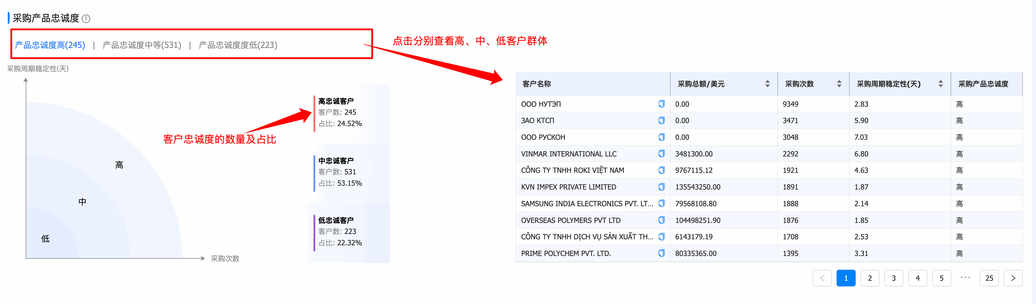 客户的忠诚度可分别从「对供应商的忠诚度」、「对采购地区的忠诚度」、「采购产品的忠诚度」三种维度分析。顺利获得衡量客户对采购商的忠诚度、地区忠诚度、产品忠诚度,区分高忠诚度、低忠诚客户,帮助企业识别机会较大的客户群体。